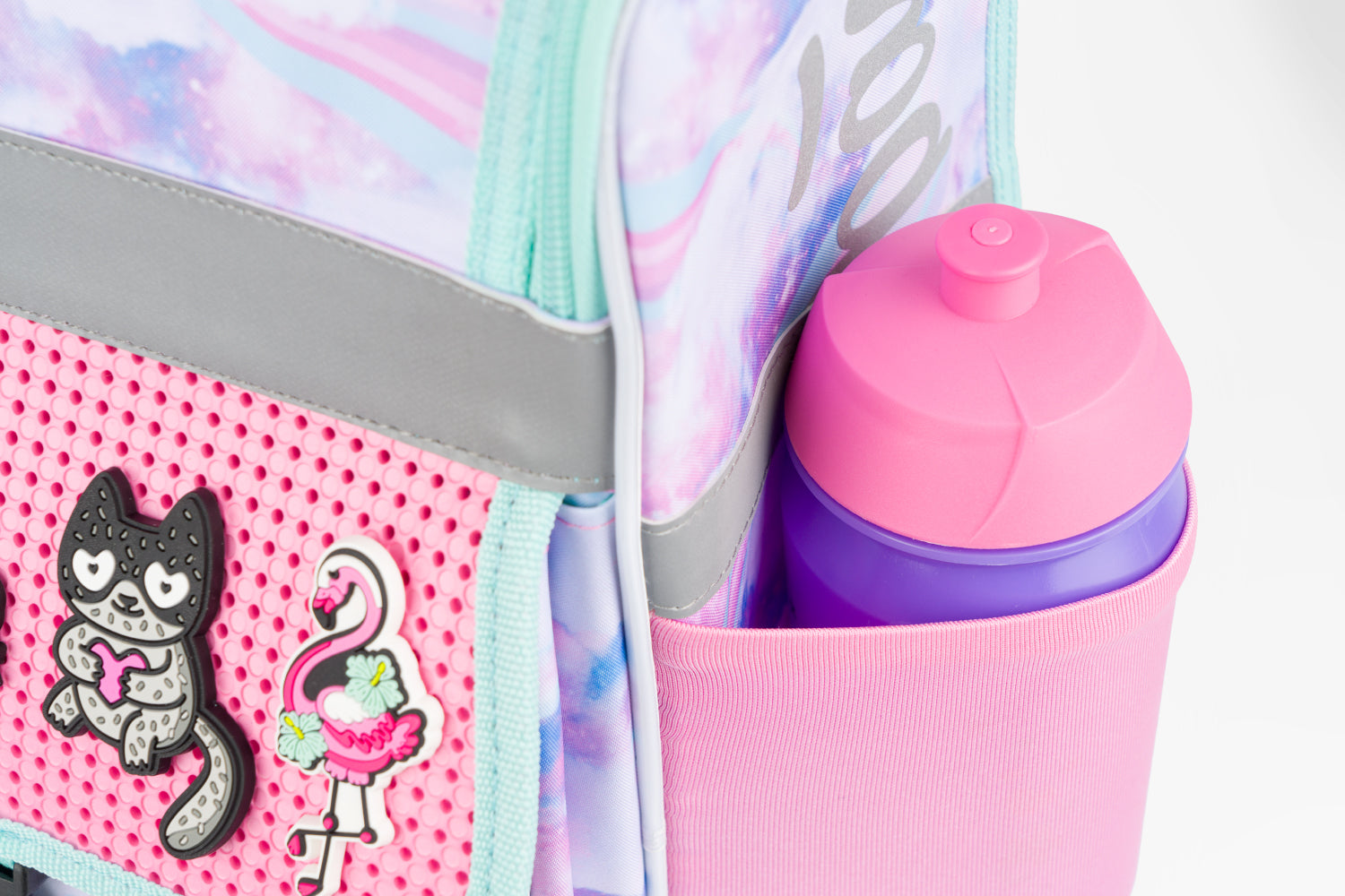 • Boční kapsy z elastického materiálu, které jsou vhodné pro jednu z našich láhví na pití.