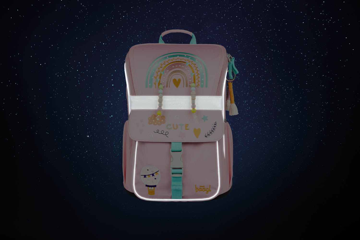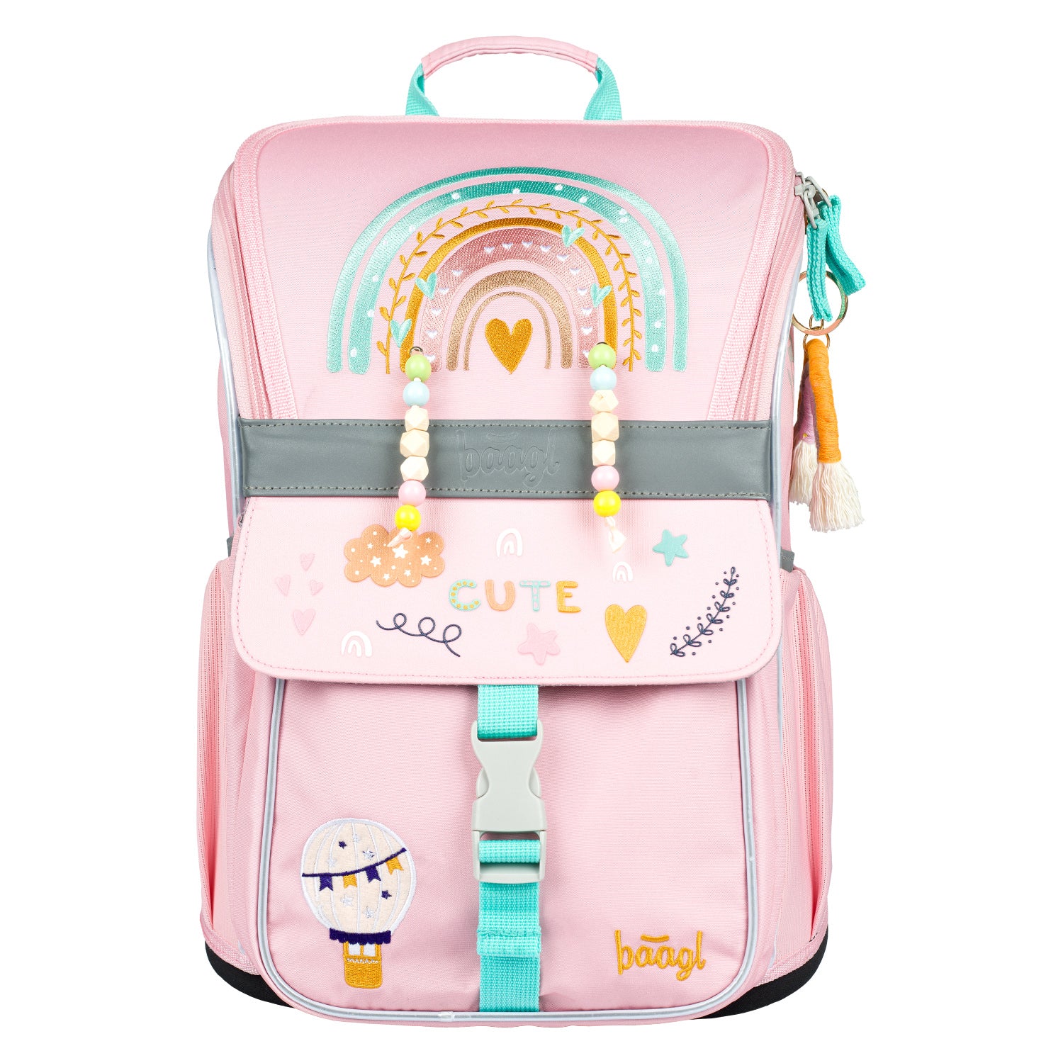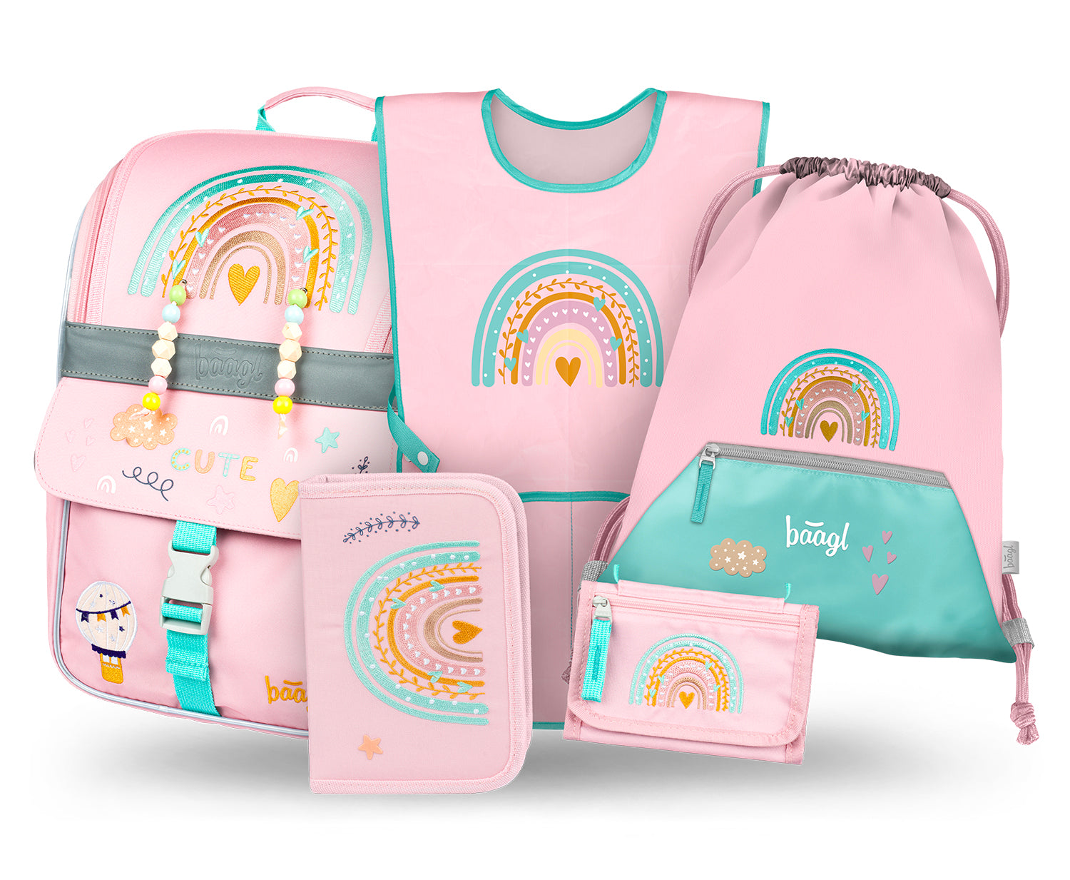 Růžová aktovka s posuvným zádovým systémem, klasický penál, sáček na obuv s možností připnutí k aktovce, zástěrka na výtvarnou výchovu a praktická peněženka – to vše ve zvýhodněném setu stvořeném pro milovnice barevné duhy.