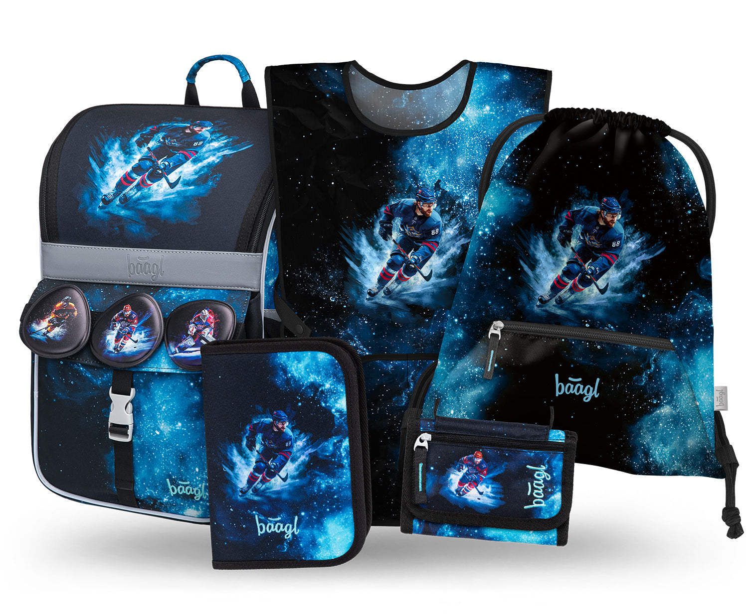Pětidílný set s hokejovým motivem zahrnuje vše nezbytné pro nástup do 1. třídy. Ergonomická školní aktovka Zippy s vyměnitelnými odznáčky je díky nízké hmotnosti ideální volbou pro každodenní nošení.