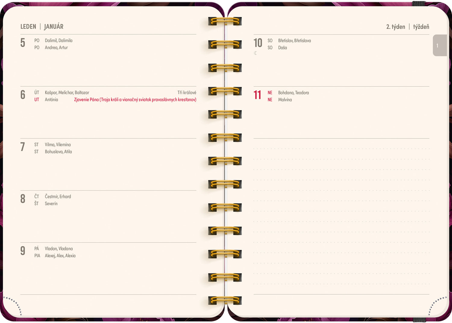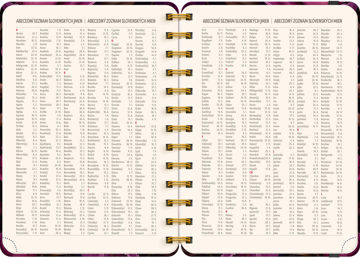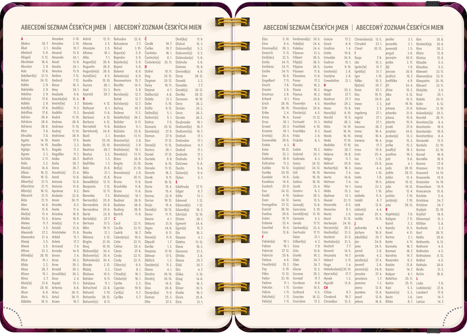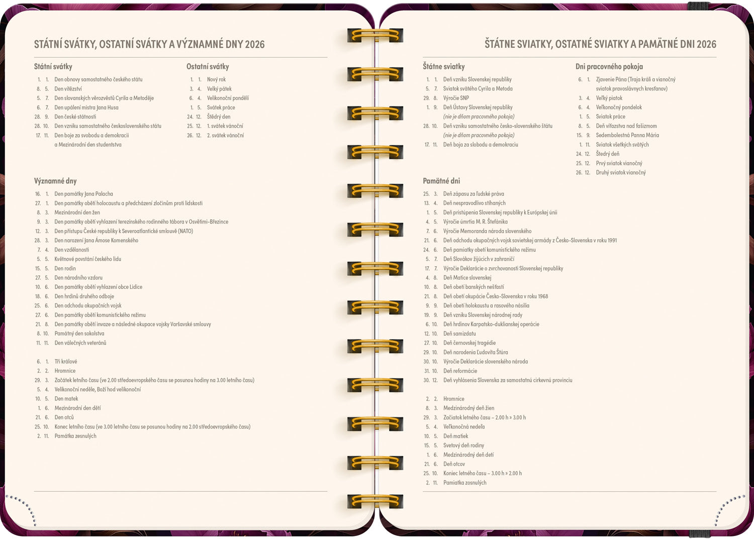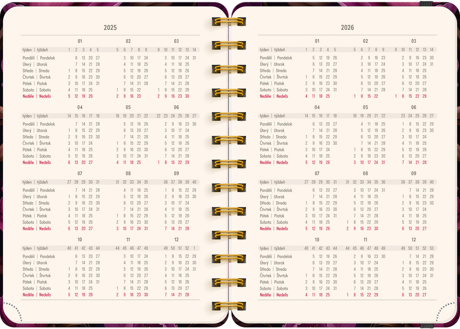 Osmnáctiměsíční diář obsahuje přehled na rok 2025 a 2026, seznam českých a slovenských jmen, česko-slovenské týdenní řádkové kalendárium se jmény a svátky a prostor na poznámky. Kalendárium začíná v červenci 2025 a končí v prosinci 2026.
