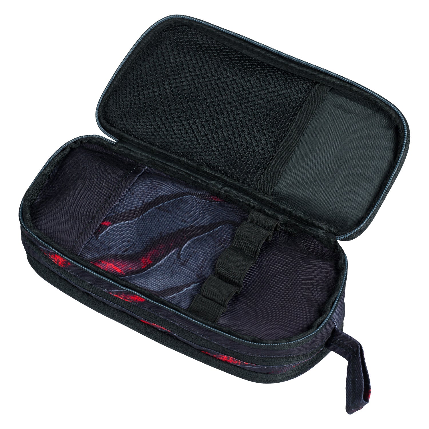 Praktické černo-červené pouzdro se třemi kapsami uzavíratelnými na zip. Dobře poslouží jako školní penál nebo cestovní pouzdro.
