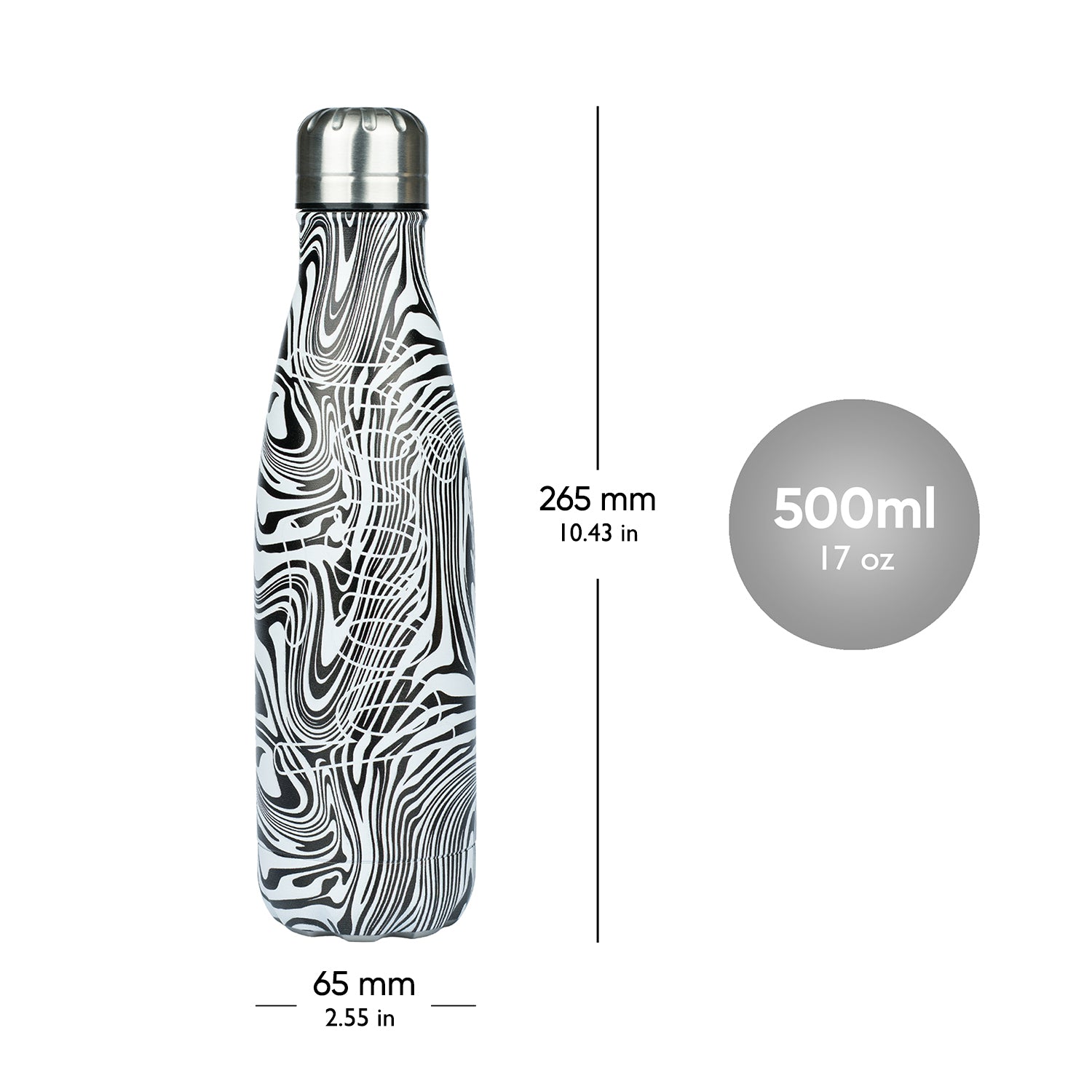 • Stylová láhev s kovovým víčkem a objemem 500 ml nejen skvěle vypadá, ale je i velmi praktická. Horký nápoj udrží teplý až 12 hodin, zatímco studené nápoje zůstanou osvěžující až 24 hodin.