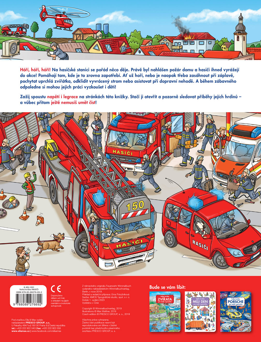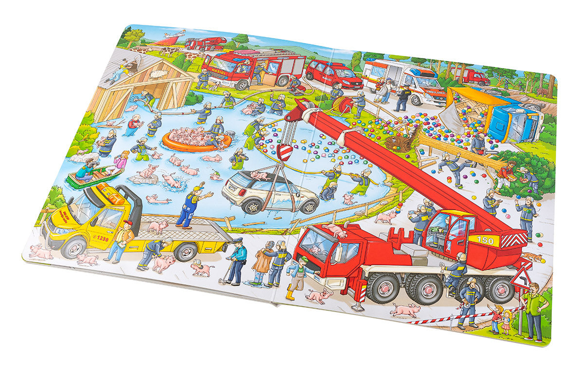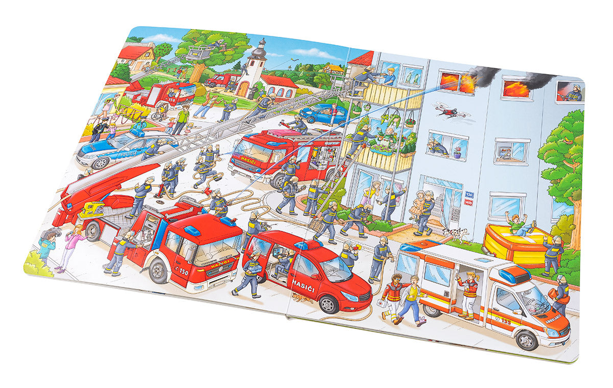 Rychle si navlékli výstroj, nasadili přilby a už se řítí se zapnutou houkačkou k hořícímu domu. Rychle připravit dlouhý hasičský žebřík a stříkačky a hasíme! Je třeba vyprostit z plamenů nešťastníky, kteří nestačili včas utéct před ohněm a zůstali uvězněni v domě. To je také práce hasičů: odvážně se vrhají do plamenů, aby před požárem zachránili všechno živé. Detailní ilustrace v další z řady velkých obrázkových knih seznámí malé čtenáře s rozmanitou prací hasiče i s každodenním životem na stanici. Stačí se jen ponořit do barevného světa obrázků a pozorně sledovat.