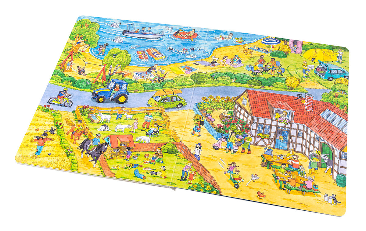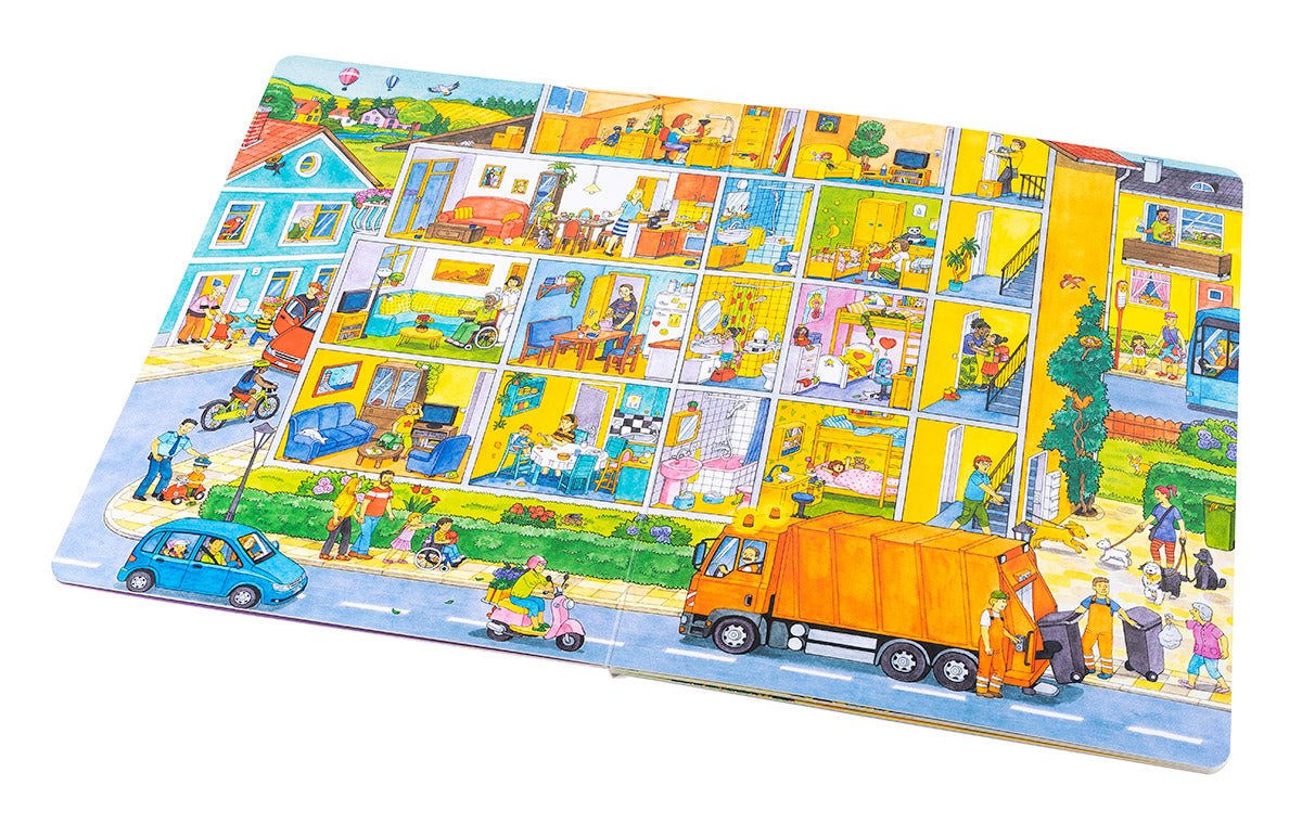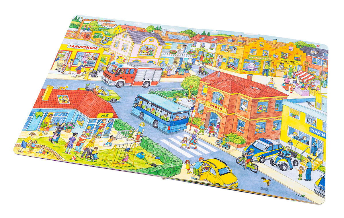 Otevři tuhle velkou obrázkovou knížku a prožij úžasný den ve městě, kde se toho od rána do večera tolik děje! Od brzkých ranních hodin se v ulicích činí popeláři, kteří se svým vozem vyvážejí plné popelnice. Čas vstát z postele, vyčistit si zuby a nasnídat se. A pak hurá do školky! Je třeba také vyřídit nákupy. Hasiči a policisté jsou v pohotovosti, na stavbě panuje čilý ruch. I v parku to žije – děti i dospělí se tu baví, pochutnávají si na zmrzlině nebo jen tak odpočívají… A co takhle krátký výlet za vodními hrátkami k jezeru či na blízkou farmu za zvířátky? Večer se pak všichni vracejí do svých domovů, aby se unavení po vzrušujícím dni uložili do postýlek a postelí. Sladké sny!