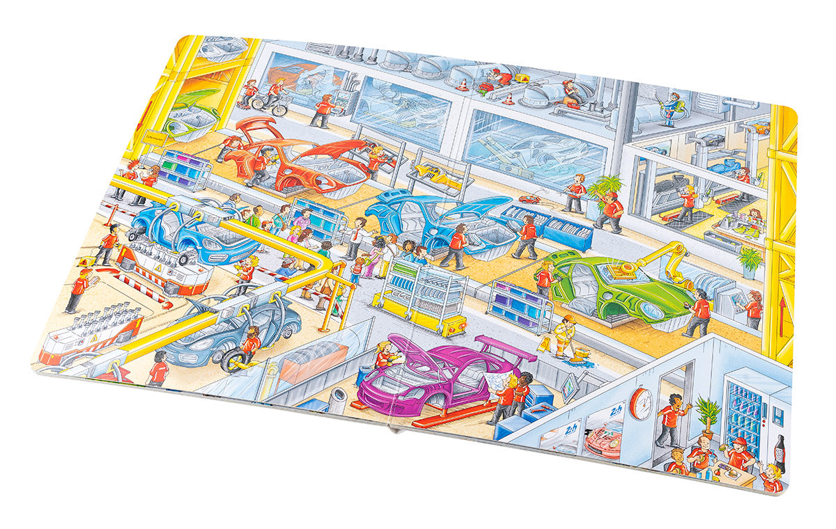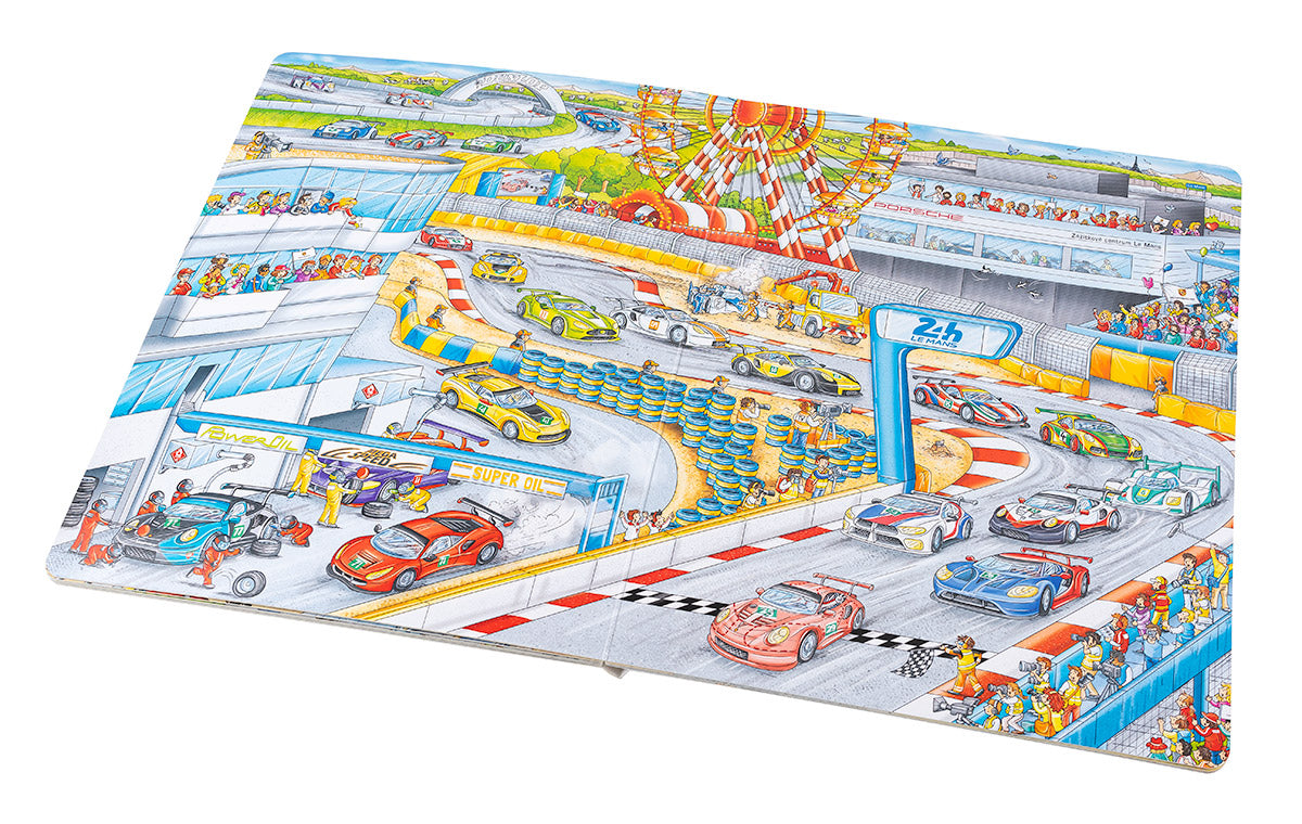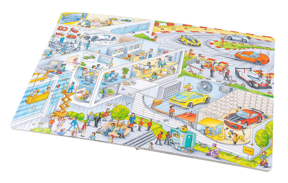 Díky této velké obrázkové knížce můžeš pozorovat zaměstnance továrny přímo při plnění úkolů souvisejících s vývojem a výrobou těchto úžasných aut. Zúčastníš se také testování nového prototypu na zkušební trati v Lipsku nebo populárního vytrvalostního závodu 24 hodin Le Mans a v muzeu Porsche pak budeš obdivovat krásné historické vozy. Knížka přibližuje nejen čilý ruch ve výrobních závodech, na okruzích nebo v továrním muzeu značky Porsche, ale seznamuje také s řadou modelů těchto obdivovaných vozů, a dozajista proto potěší automobilové nadšence všech věkových kategorií!