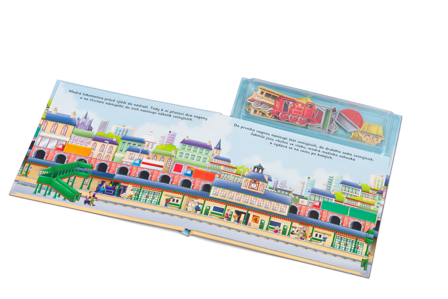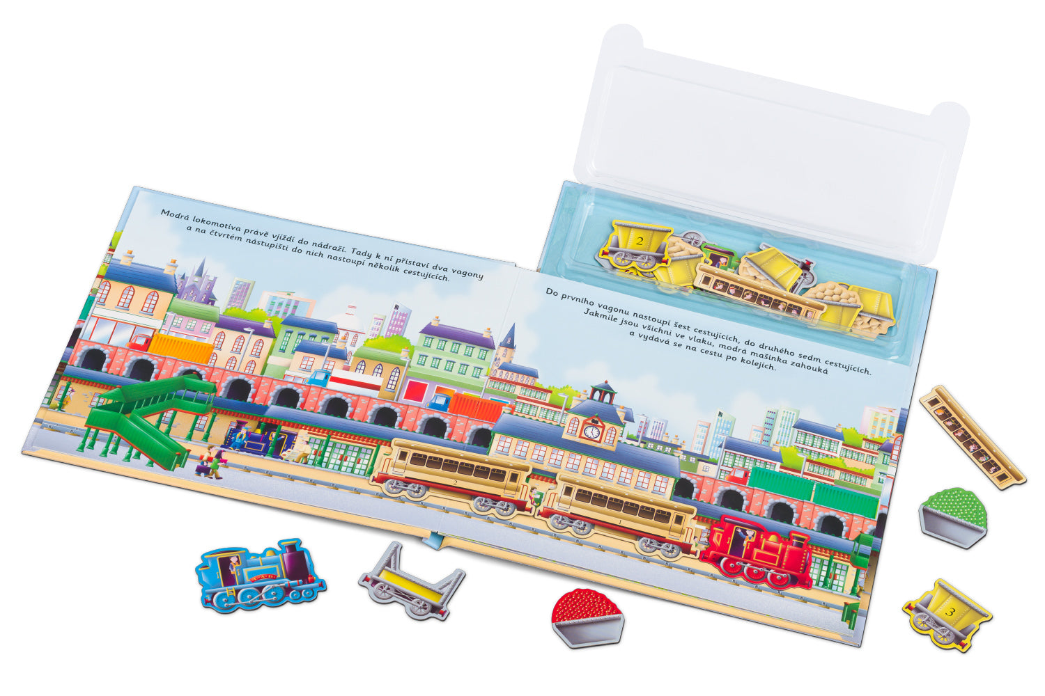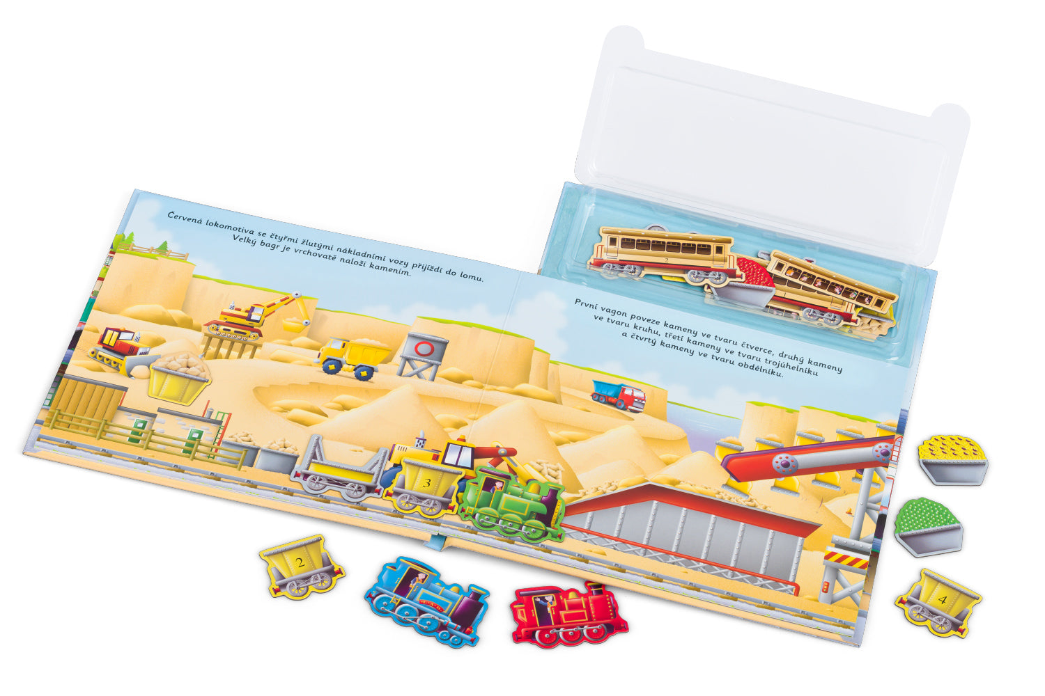 Húúú, húúú – pozor, přijíždí vlak! V přístavu, na vlakovém nádraží, na stavbě a po náročném dni v depu – tam všude najdeme lokomotivy a vagony pro osobní nebo nákladní přepravu. Tam všude nám vláčky pomáhají. Na každé stránce téhle knížky objeví děti kratičký příběh, který mohou spoluvytvářet pomocí magnetek. A až si do sytosti vyhrají, mohou všechny vozy zase „zaparkovat“ zpátky do úložného boxu, kde budou připraveny na další skvělou zábavu.
