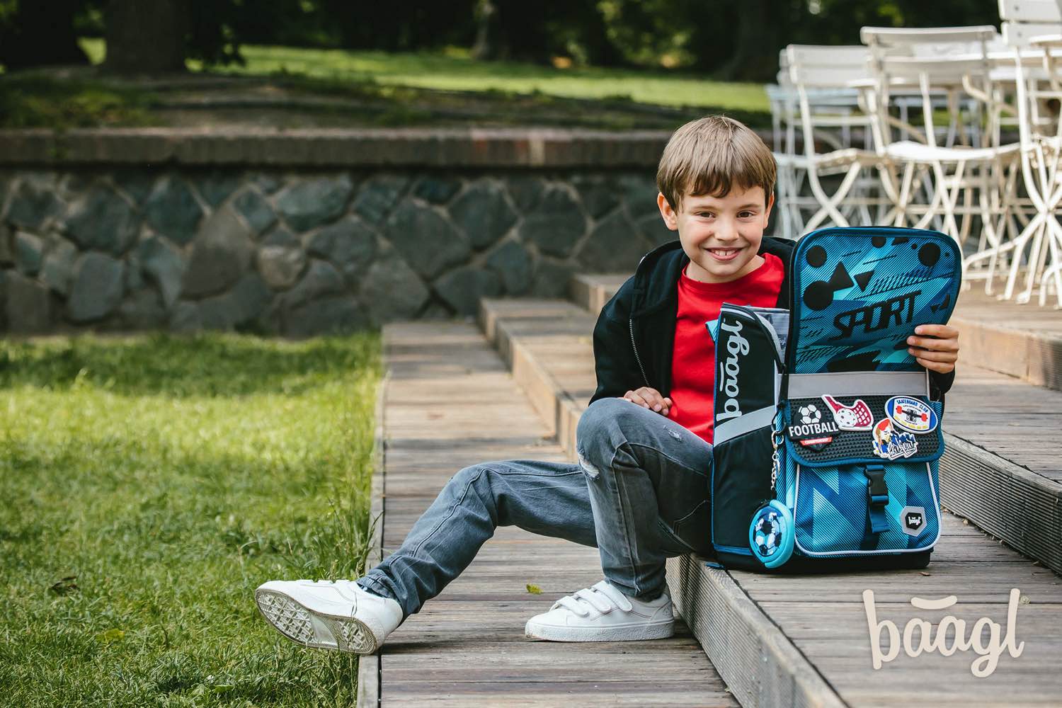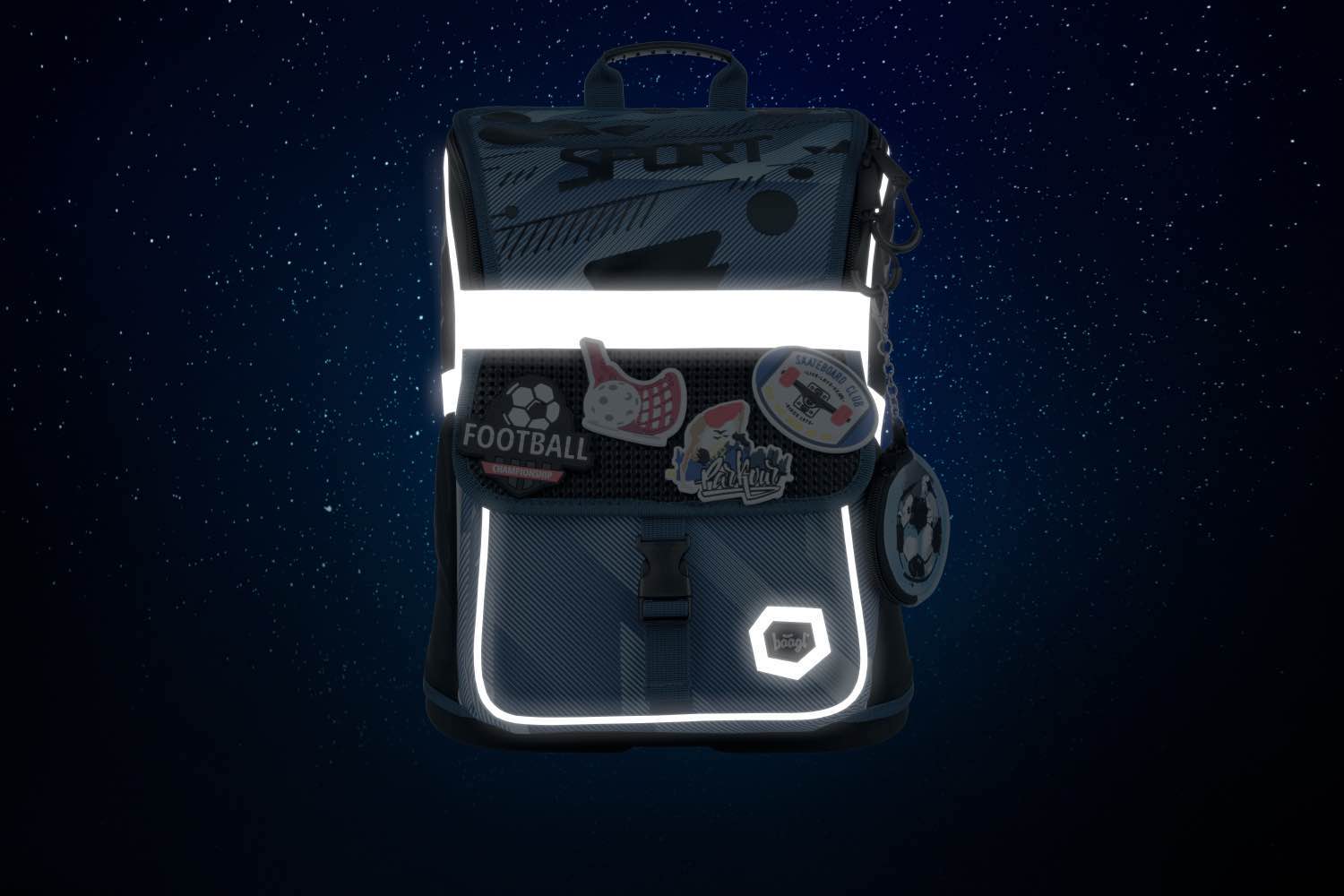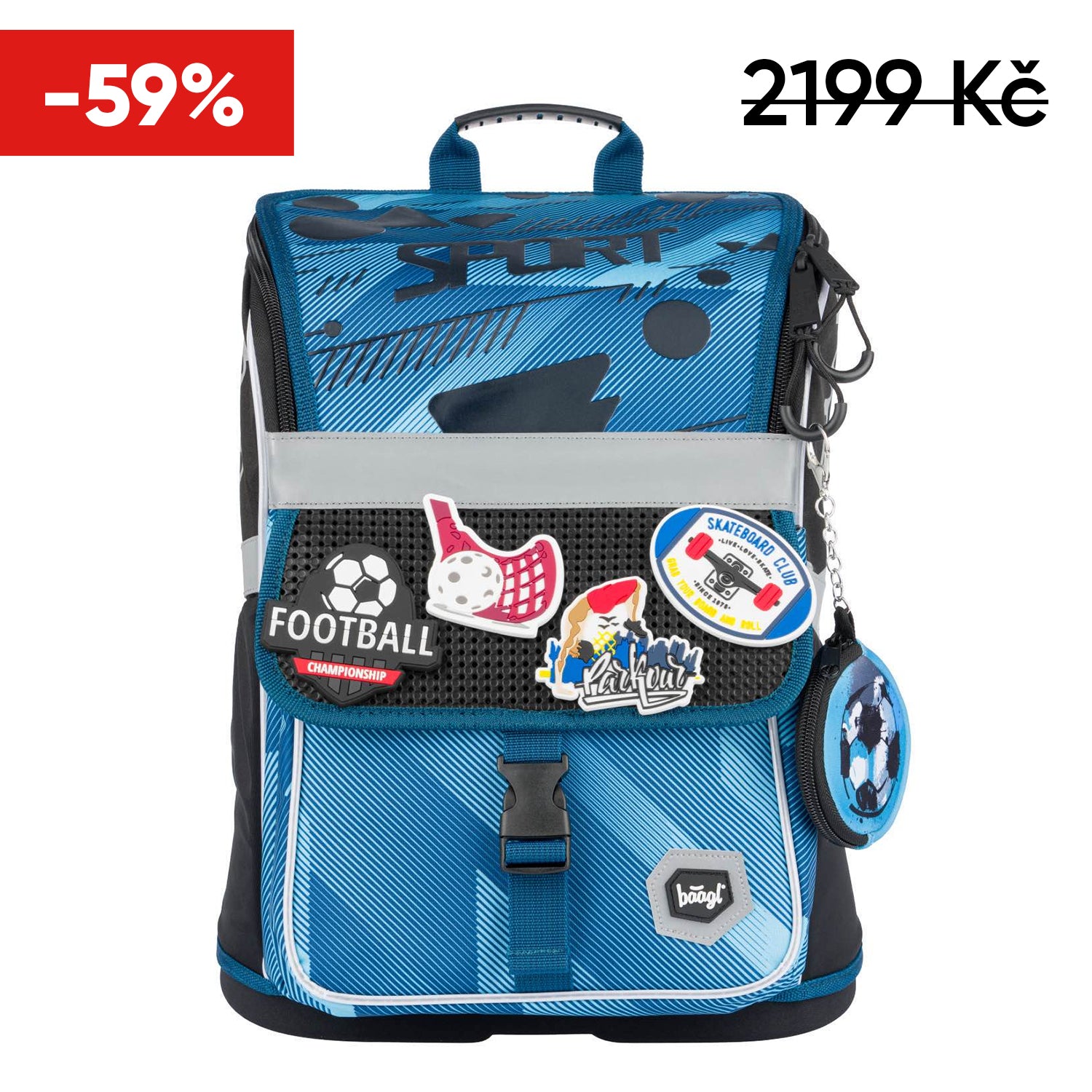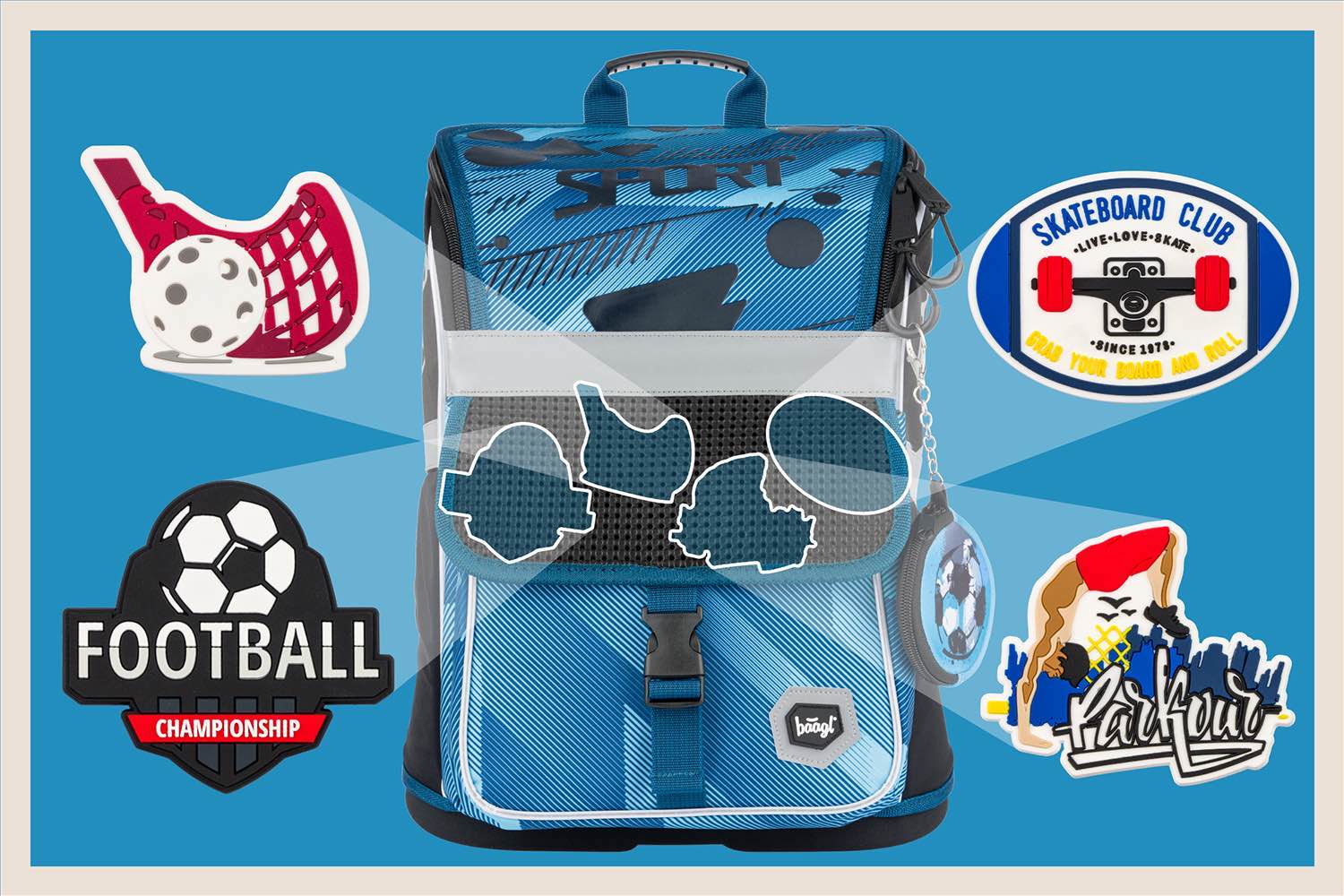 • Na klopu přední kapsy můžete libovolně připevňovat odznáčky, které jsou k aktovce jako dárek.